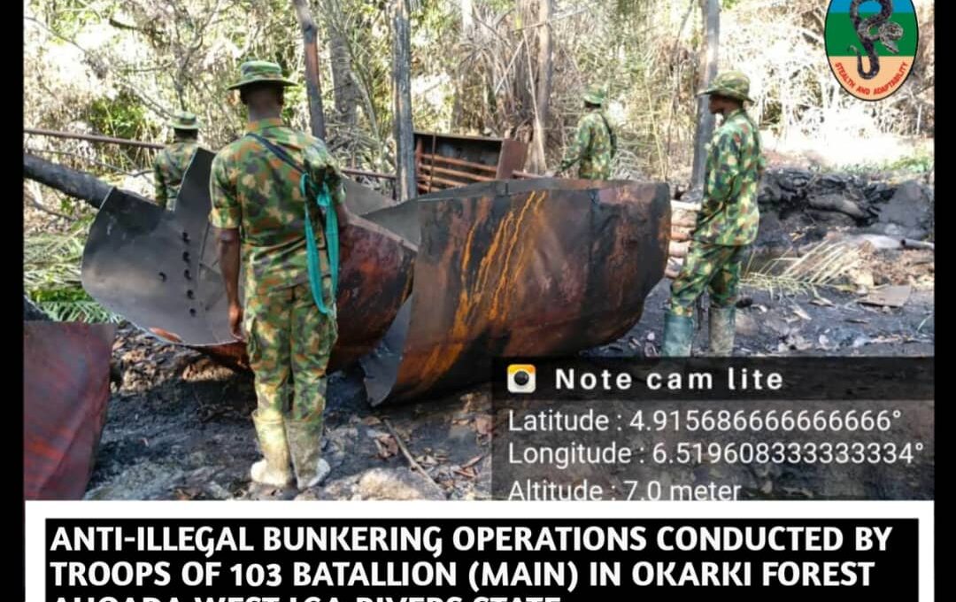 In Rivers State, around Kilometer 45 general area in Degema LGA, he said, six illegal refining sites were uncovered, with over 5,000 litres of stolen crude confiscated.